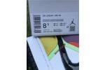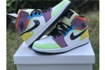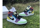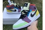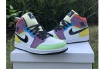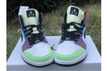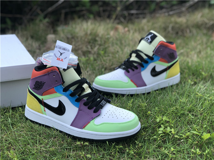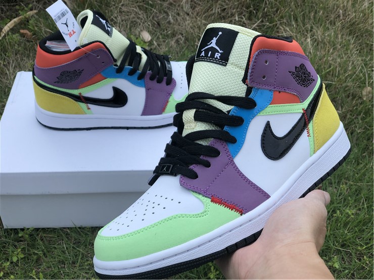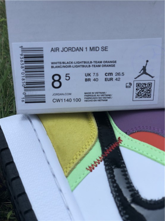 The women’s Air Jordan 1 Mid SE ‘Lightbulb’ showcases an array of mixed materials and hues on the upper. The design uses a white leather base, accented with patent leather detailing on the black Swoosh and blue eyestay. Suede paneling in green and yellow are applied to the toe and heel, while purple nubuck appears on the collar flap and forefoot overlay. Exposed zigzag stitching in contrasting red gives the shoe an unfinished look.