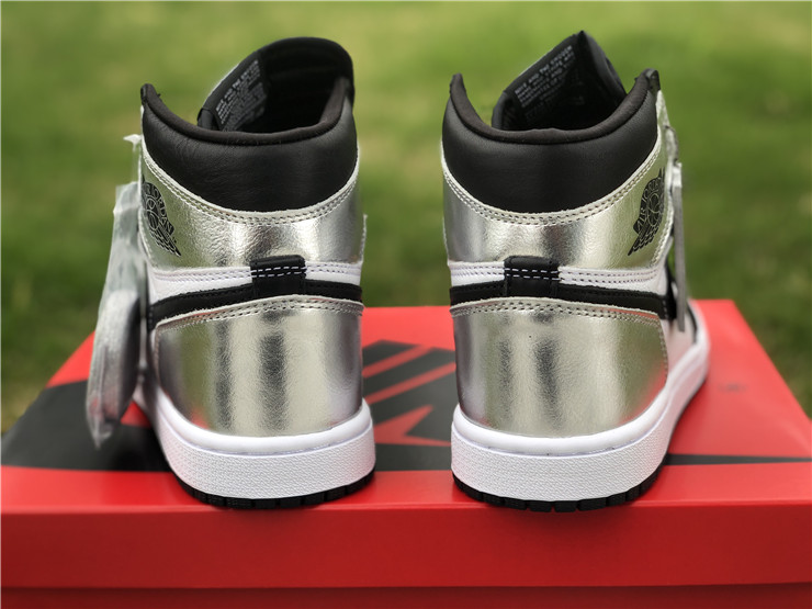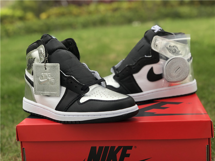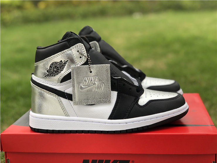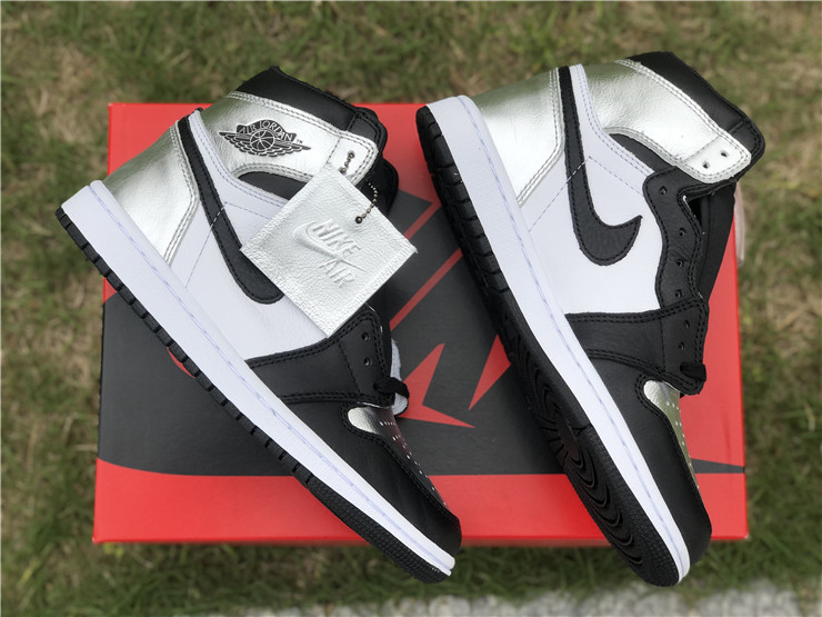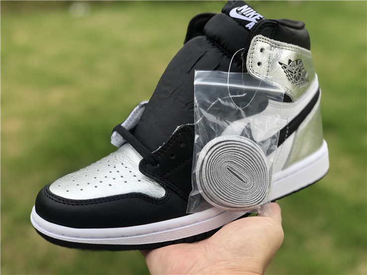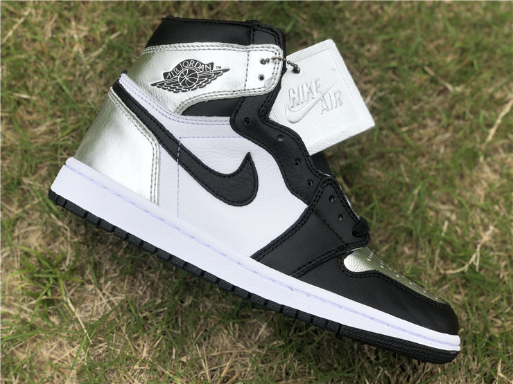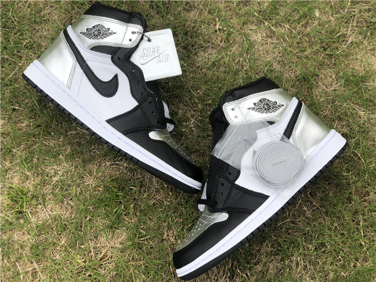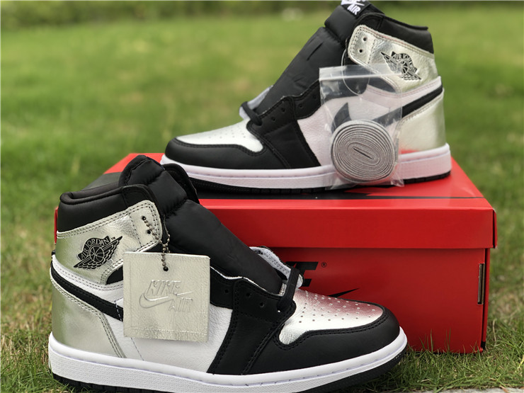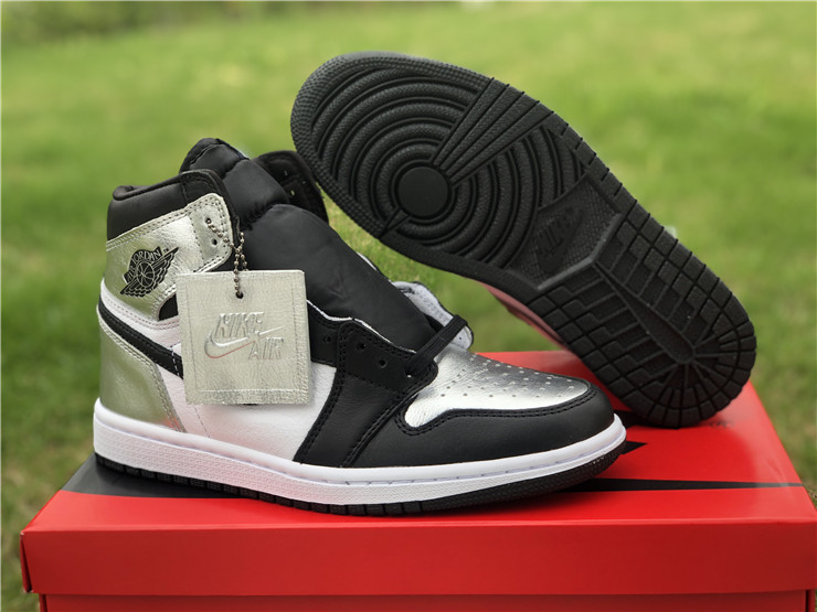 The women’s Air Jordan 1 Retro High OG ‘Silver Toe’ adopts color blocking that recalls the Air Jordan 1 ‘Gold Toe’ from 2018. This pair discards the patent leather build of the older shoe in favor of a standard leather upper, featuring a clean white base with contrasting black forefoot overlays. A shiny metallic silver finish distinguishes the toe box, heel panel and collar flap, the latter stamped with a Jordan Wings logo on the lateral side. Additional branding elements include a black leather Swoosh and a woven Nike tag atop the nylon tongue.