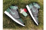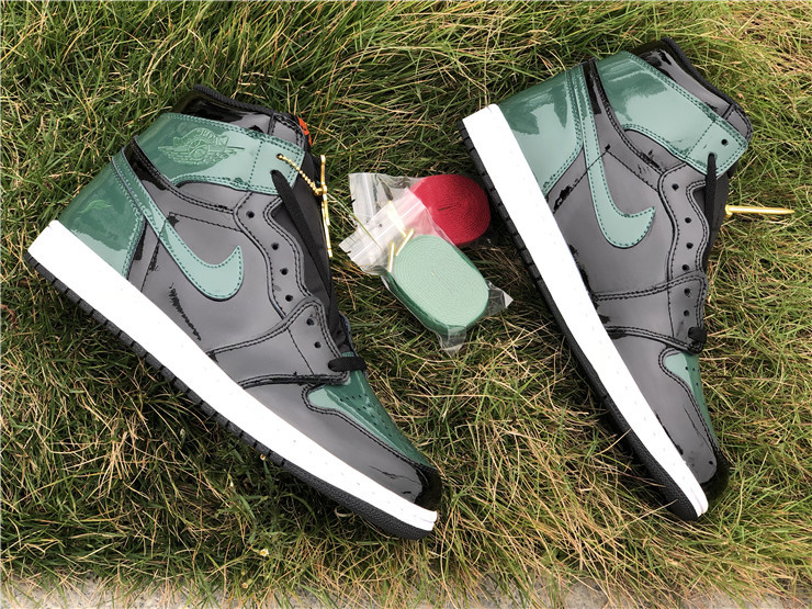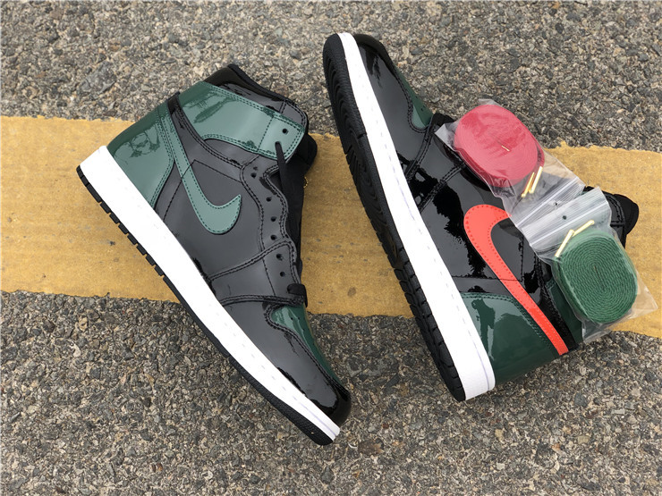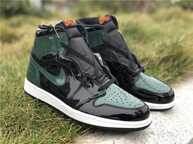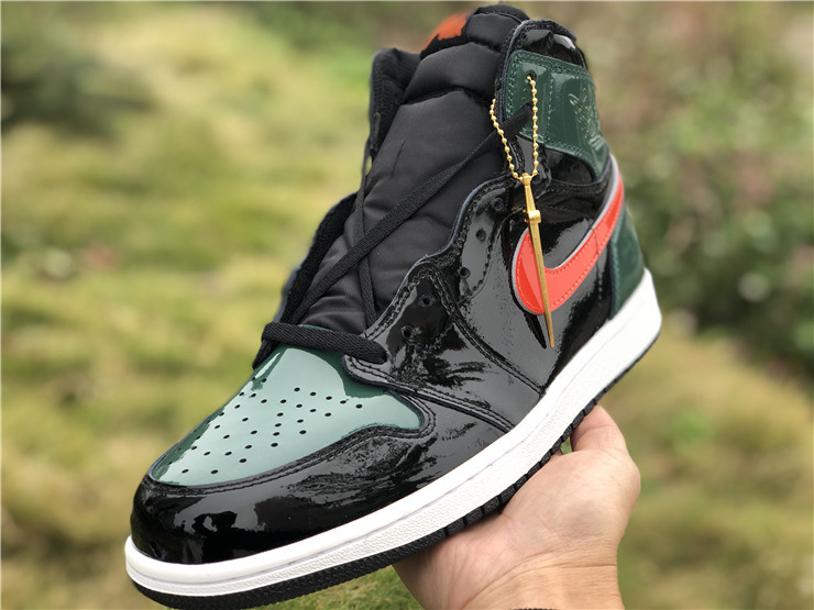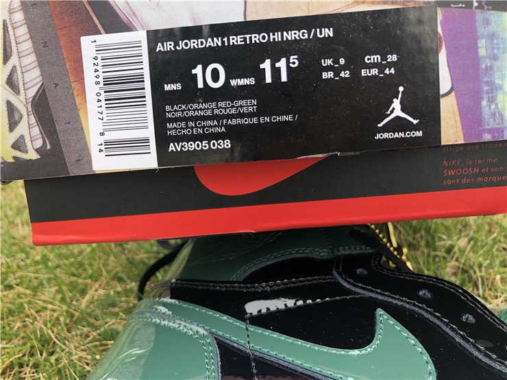 Jordan Brand teamed up with SoleFly to celebrate Art Basel Miami, the international art fair that takes place the first week of December every year. The SoleFly x Air Jordan 1 Retro High OG 'Art Basel' Friends & Family features a patent black leather upper with green leather overlays on the toe box, collar, and heel. The high top also boasts embossed Wings details, quilted tongue, and MIA and 305 lettering on the inside of the tongue. The shoe features alternating Swooshes, with a bright orange on the left lateral and right medial shoe, and green on the right lateral and left medial shoe.