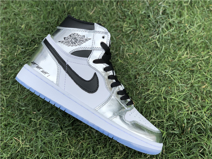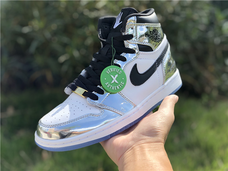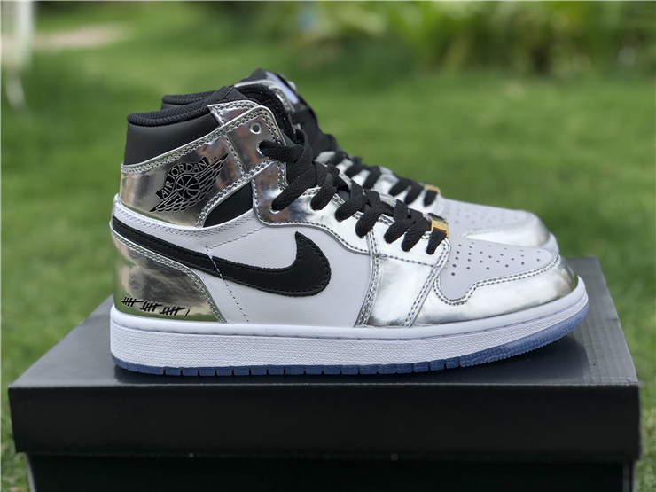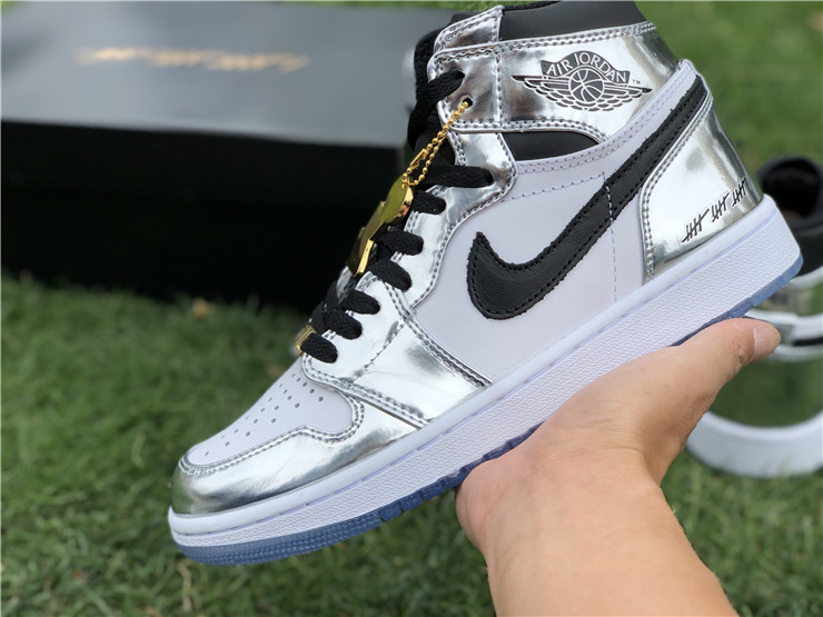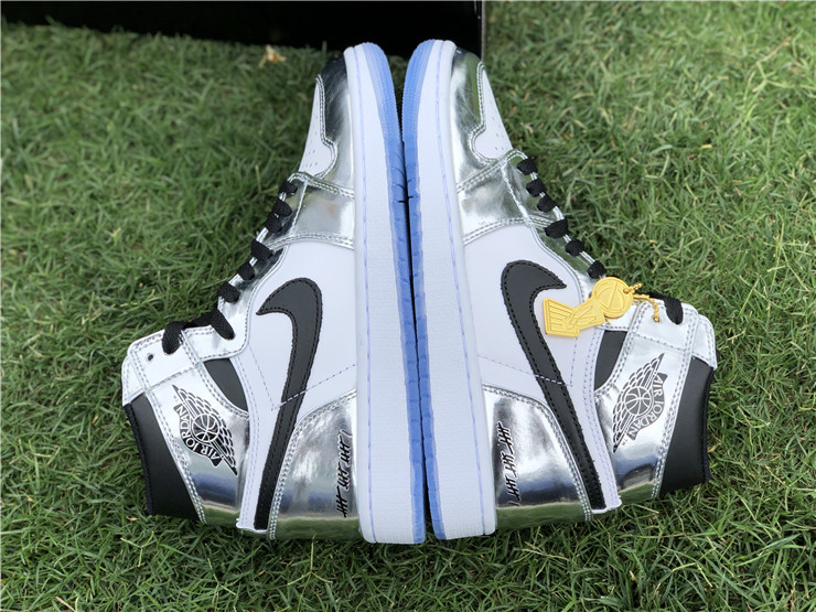 This Air Jordan 1 Retro High 'Pass the Torch' is a tribute to San Antonio Spurs forward Kawhi Leonard and his MVP performance in the 2014 NBA Finals. It features a metallic silver and white leather upper with black accents, a white midsole, and an icy blue translucent outsole. Other details include Kawhi’s ‘Claw’ logo on the left tongue, a gold ‘2004’ branded deubré, and 16 tally marks on the heels and laces denoting the number of games the Spurs won to take home the Larry O’Brien Trophy. The sneaker dropped in Nike's "Art of a Champion" Collection in April 2018.