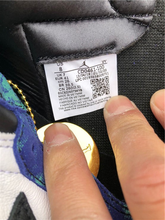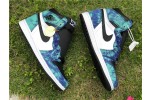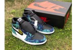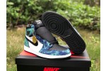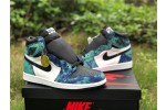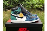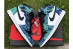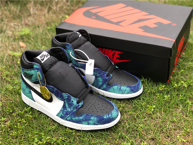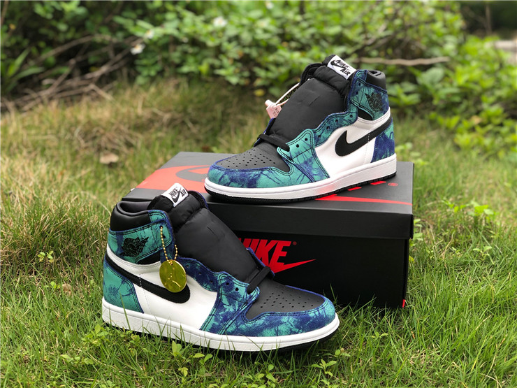 The Jordan 1 Retro High Tie Dye (W) consists of a white and black leather upper with blue and green tie-dye print leather overlays. A black Swoosh, white midsole, and black outsole complete the design