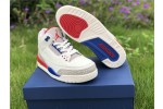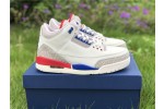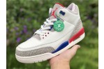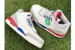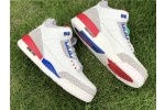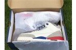 Inspired by Michael Jordan’s uniform for a 1988 charity game in which he scored 54 points, the Air Jordan 3 Retro ‘International Flight’ sports a patriotic color scheme on an Off-White leather build. Sport Royal accents grace the eyelets, midsole, and embossed Jumpman heel branding, while contrasting pops of Fire Red stand out on the rear midsole segment and the Jumpman logo on the tongue, with the right one distinguished by Michael Jordan’s signature. The signature Jordan elephant print is rendered in light grey on the leather overlays at the toe and heel.