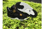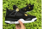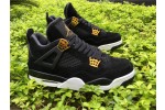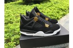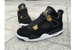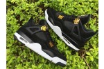 The Air Jordan 4 Retro ‘Royalty’ pairs a monochromatic black suede upper with contrasting metallic gold accents. They shine on the signature molded eyelets and a Jumpman icon on the synthetic leather heel panel. Additional Jumpman branding lands on the woven tongue tag and rubber outsole, featuring a traditional herringbone traction pattern for optimal grip. Lightweight cushioning is provided by a polyurethane midsole, enhanced with a visible Air sole unit under the heel.
