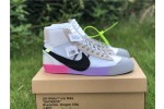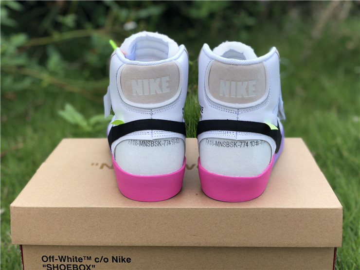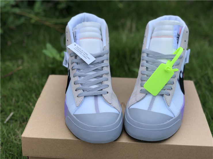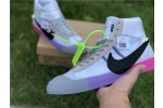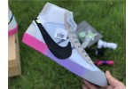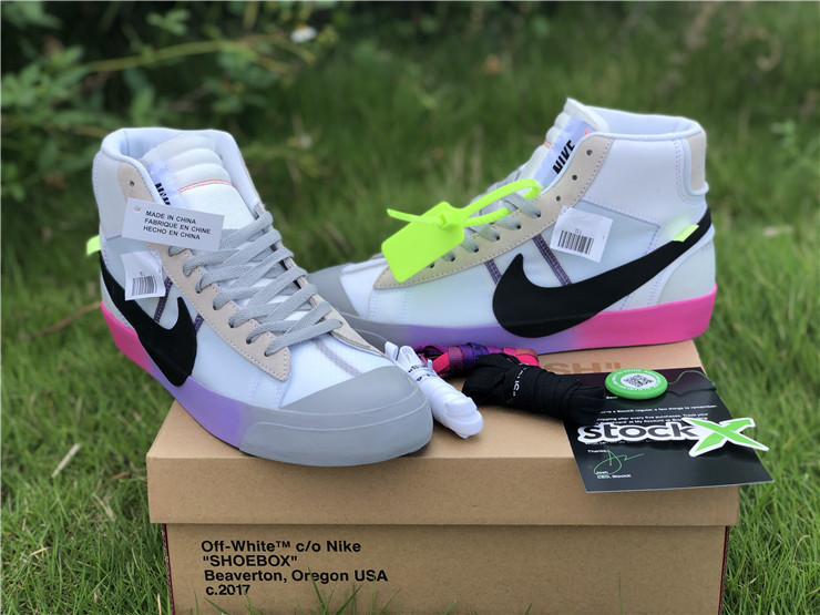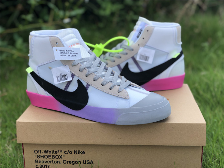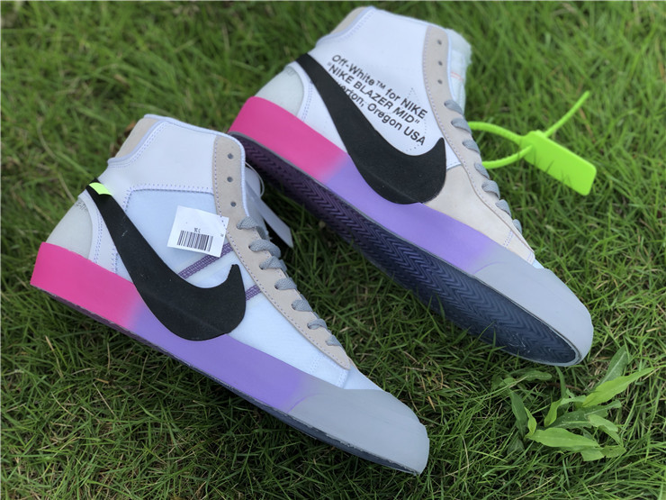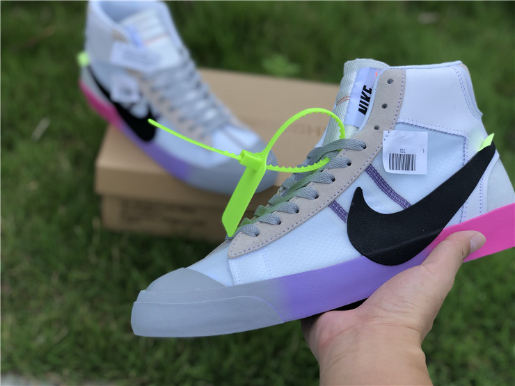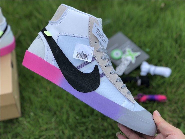 OFF-WHITE X Nike Blazer Mid Serena "Queen" AA3832-002, The Off-White x Blazer Studio Mid ‘Queen’ was designed by Virgil Abloh as part of a larger collection celebrating Serena Williams’ appearance at the 2018 U.S. Open. The mid-top sports a Wolf Grey upper built with a combination of leather, suede and translucent textile, accented with an oversized Swoosh in black. The rubber midsole features gradient coloring that transitions from pink to purple to grey. Signature Off-White text adorns the side panel on the shoe’s medial side, and "QUEEN OF QUEENS, NY" is stamped on the volt zip-tie